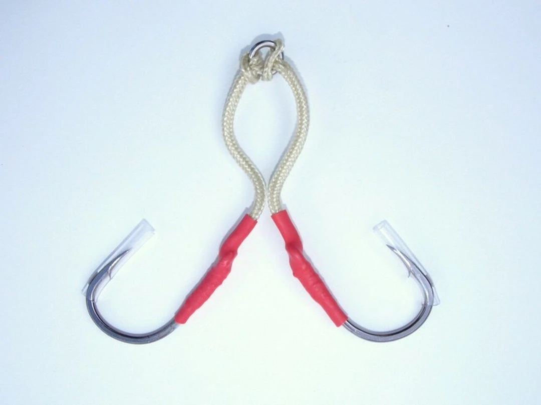 Dual black nickel assist hooks come conveniently rigged with 2 hooks to be rigged on most any vertical style jig.