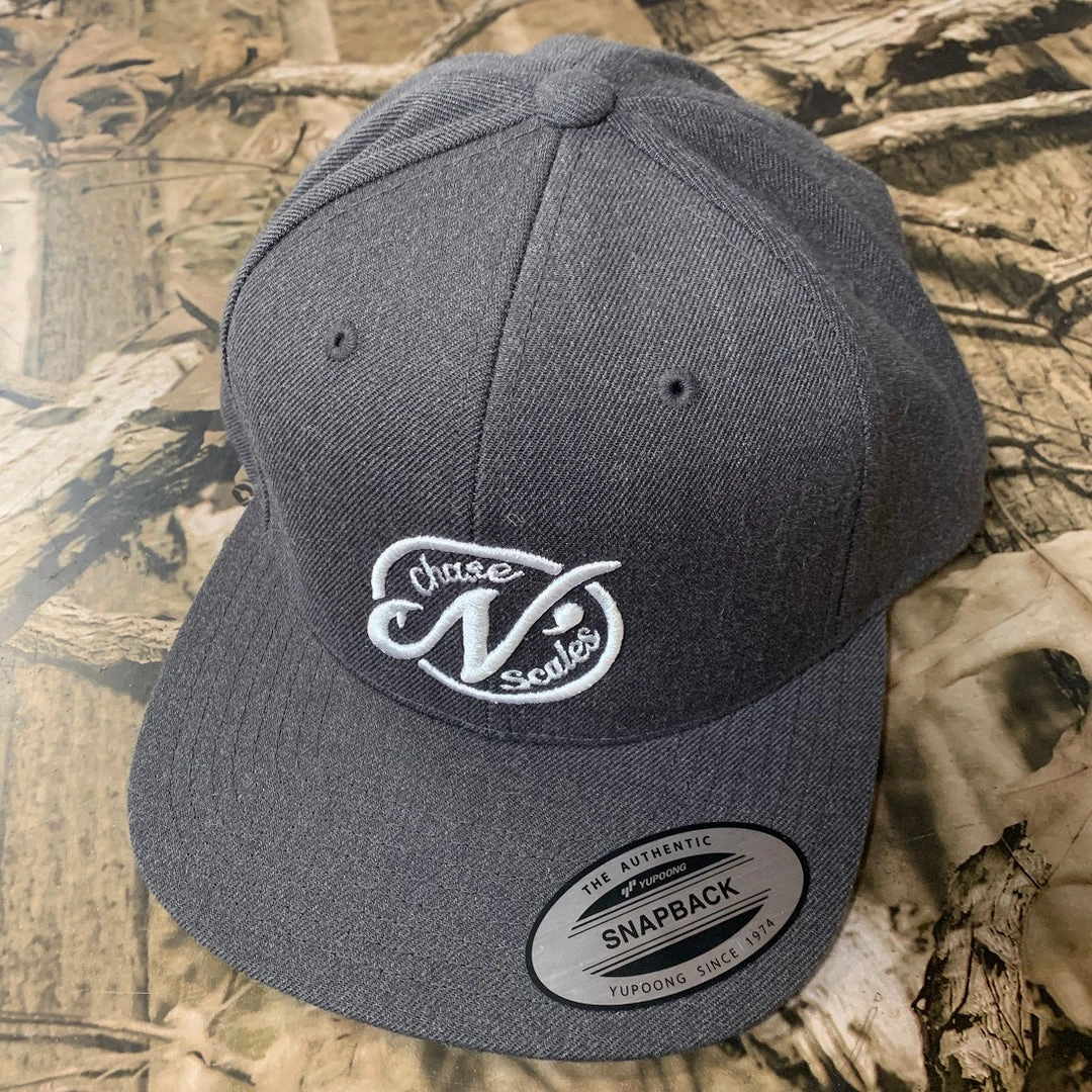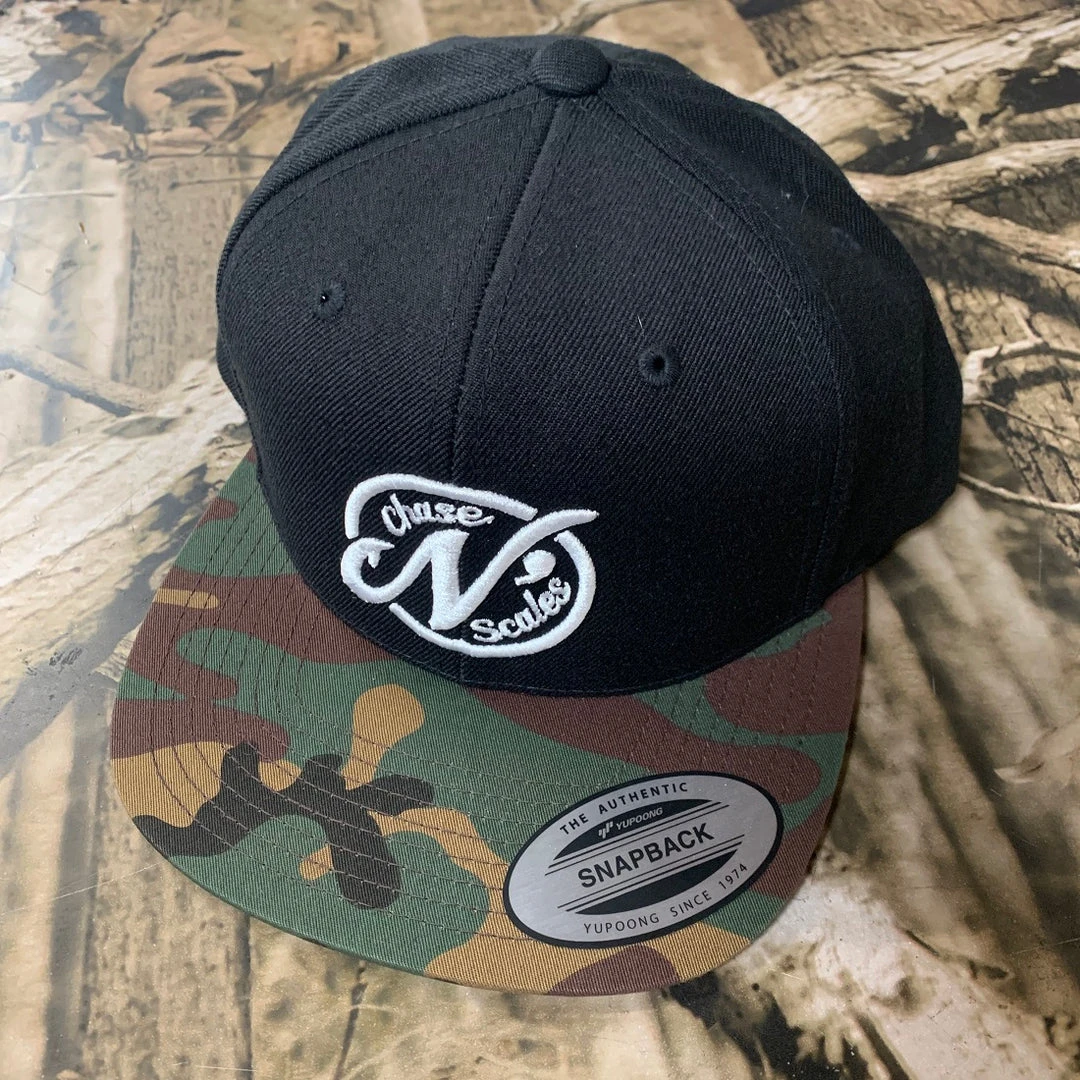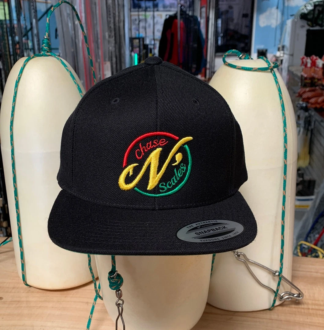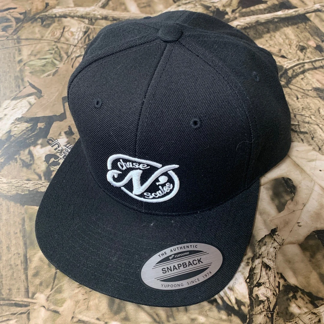Embroidered logo on black Buckram backed panel, flatbill snap-back.
