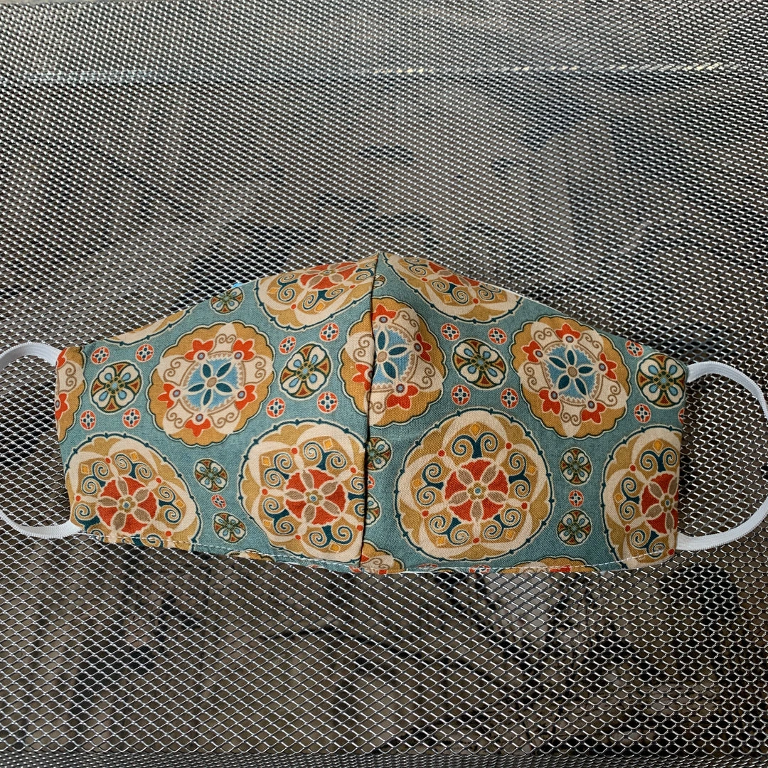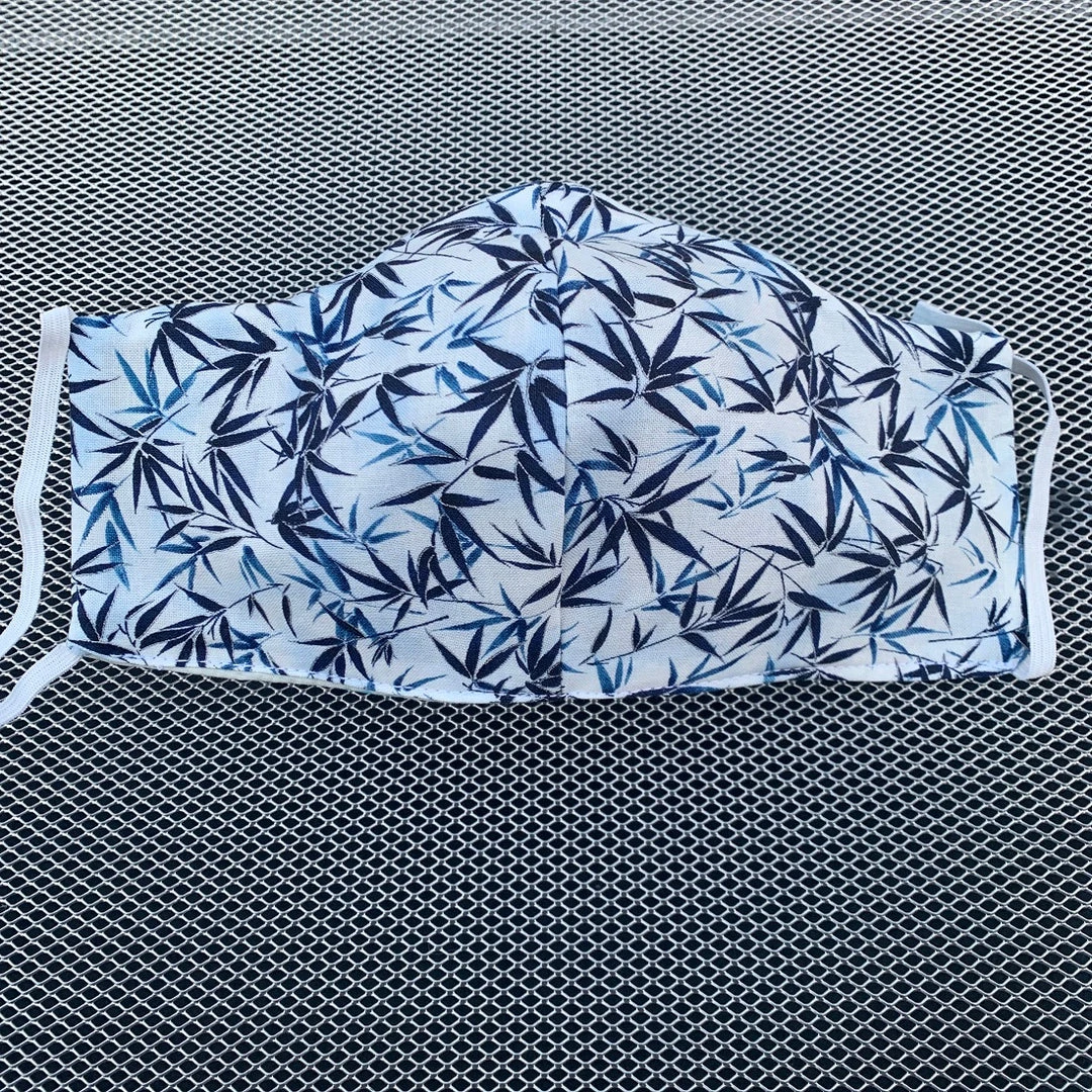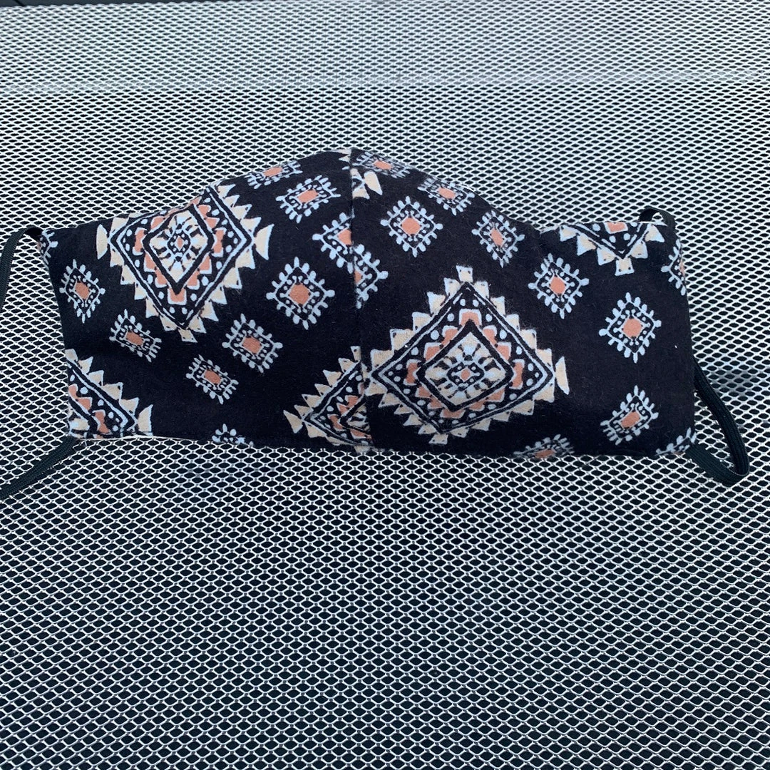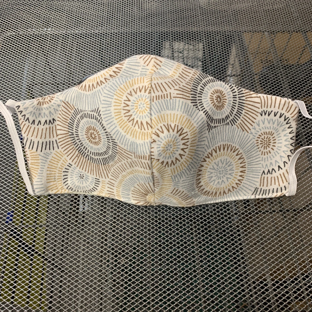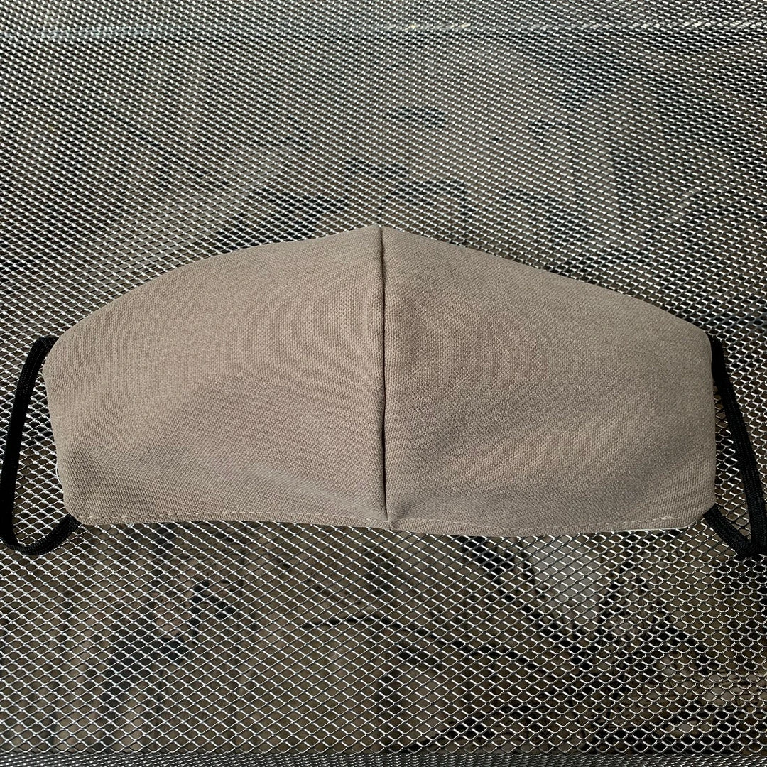 3 layer construction. 2 cotton panels with a 10 micron filter sewn in between. Elastic ear loops.