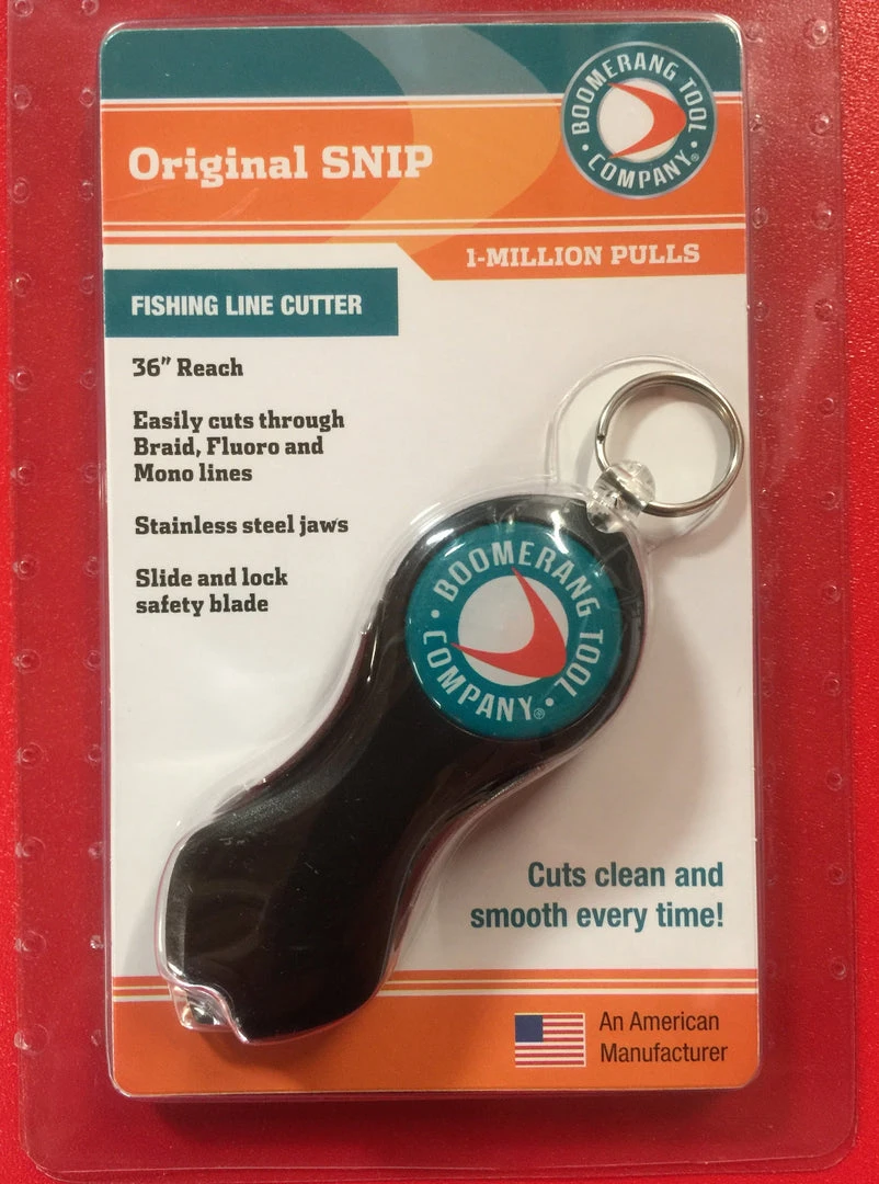 The Boomerang Snips are compact, lightweight, extremely durable, and they can make clean cuts with just one hand (even with gloves on) through monofilament, fluorocarbon, and braided line (50-lb test) quickly and easily.