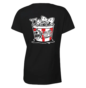 KILLFISH CO.’s bucket logo on a women’s black v-neck t-shirt.